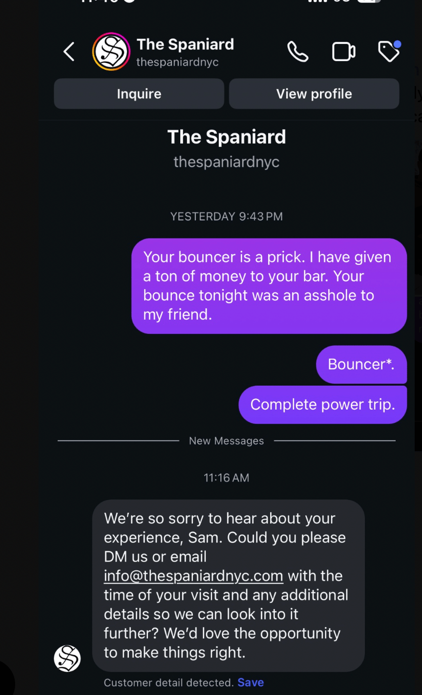 Sam came to my defense outside, tried his best to fix the situation and resorted to Instagram DM to settle the score (see below). He says this story will make his next podcast…their guest is Jerry Seinfeld! Sam also called me his ‘friend’ in the DM so I got that going for me!