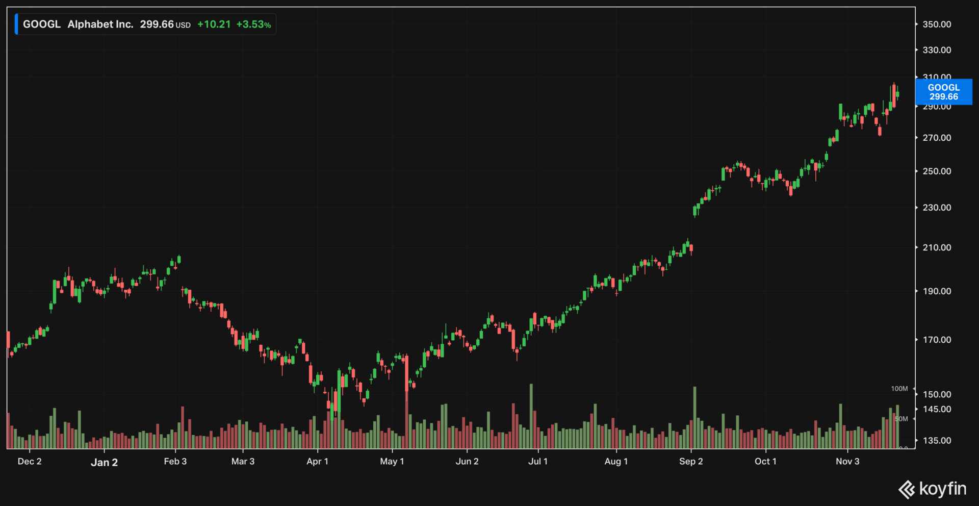 Right now $GOOG ( ▲ 4.47% ) is up another 6 percent today near $320 and now up over 50 percent on the year.