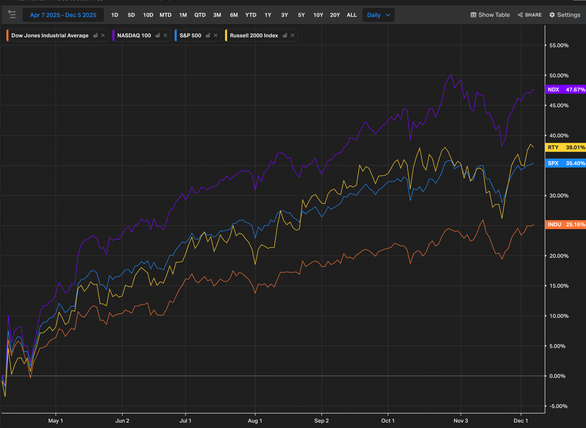 Here are the index returns from April 6th to Friday…not too shabby: